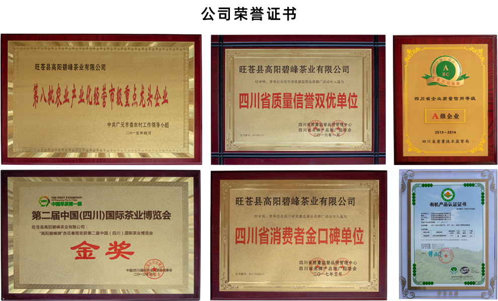 公司推出的“杏花春雨” “高阳碧峰”、“苍山翠竹”、“高阳春雪”、“广元黄茶”、“高阳红茶”等各系列产品兼有色翠、香郁、味醇、形美等特点,深受消费者的青睐。其中,“杏花春雨”获得第二届中国(四川)国际茶业博览会金奖;“苍山翠竹”、“高阳春雪” 获得第三届米仓山杯铜奖;“广元黄茶”荣获2021年首届广元黄茶斗茶大赛金奖。公司先后获得“四川省质量信誉双优单位”、“第八批农业产业化经营市级重点龙头企业”、“四川省消费者金口碑单位”、“2023年获得高新技术企业证书”等荣誉称号。